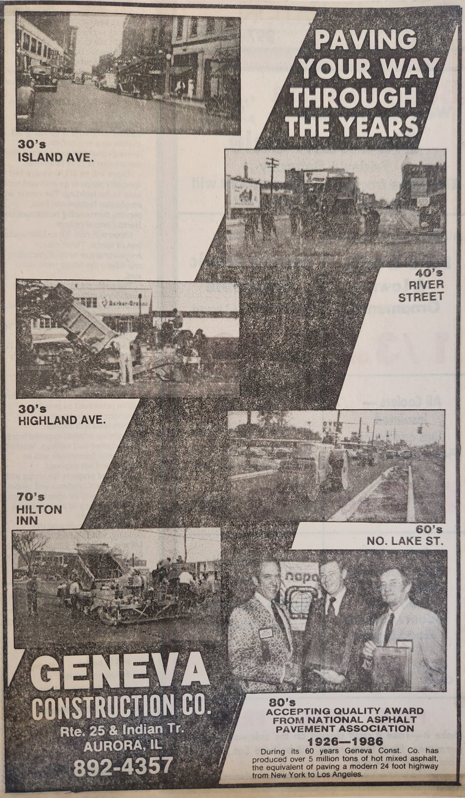 Geneva Construction Company was founded in 1926 in Geneva, Illinois by the McCarthy Improvement Co. of Davenport, Iowa which at the time was building many of the early residential streets in the Fox Valley. The McCarthy Improvement Co. named Gilbert N. Bryan as the first president of Geneva Construction Company. In 1935 the company relocated to Aurora, Illinois in the Old Second National Bank Building until it moved in 1967 to its current site on the Fox River at Indian Trail. Our asphalt plant was located at the Indian Trail location until 1970 when it was moved to its current location on Butterfield Road in North Aurora. This plant was recently updated to a 400 ton per hour drum plant with storage capacity of 1,300 ton.