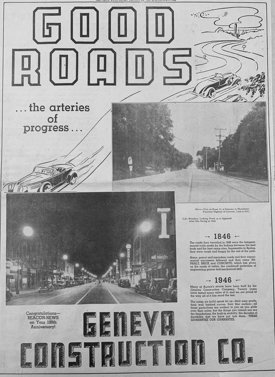 Geneva Construction Company was founded in 1926 in Geneva, Illinois by the McCarthy Improvement Co. of Davenport, Iowa which at the time was building many of the early residential streets in the Fox Valley. The McCarthy Improvement Co. named Gilbert N. Bryan as the first president of Geneva Construction Company. In 1935 the company relocated to Aurora, Illinois in the Old Second National Bank Building until it moved in 1967 to its current site on the Fox River at Indian Trail. Our asphalt plant was located at the Indian Trail location until 1970 when it was moved to its current location on Butterfield Road in North Aurora. This plant was recently updated to a 400 ton per hour drum plant with storage capacity of 1,300 ton.